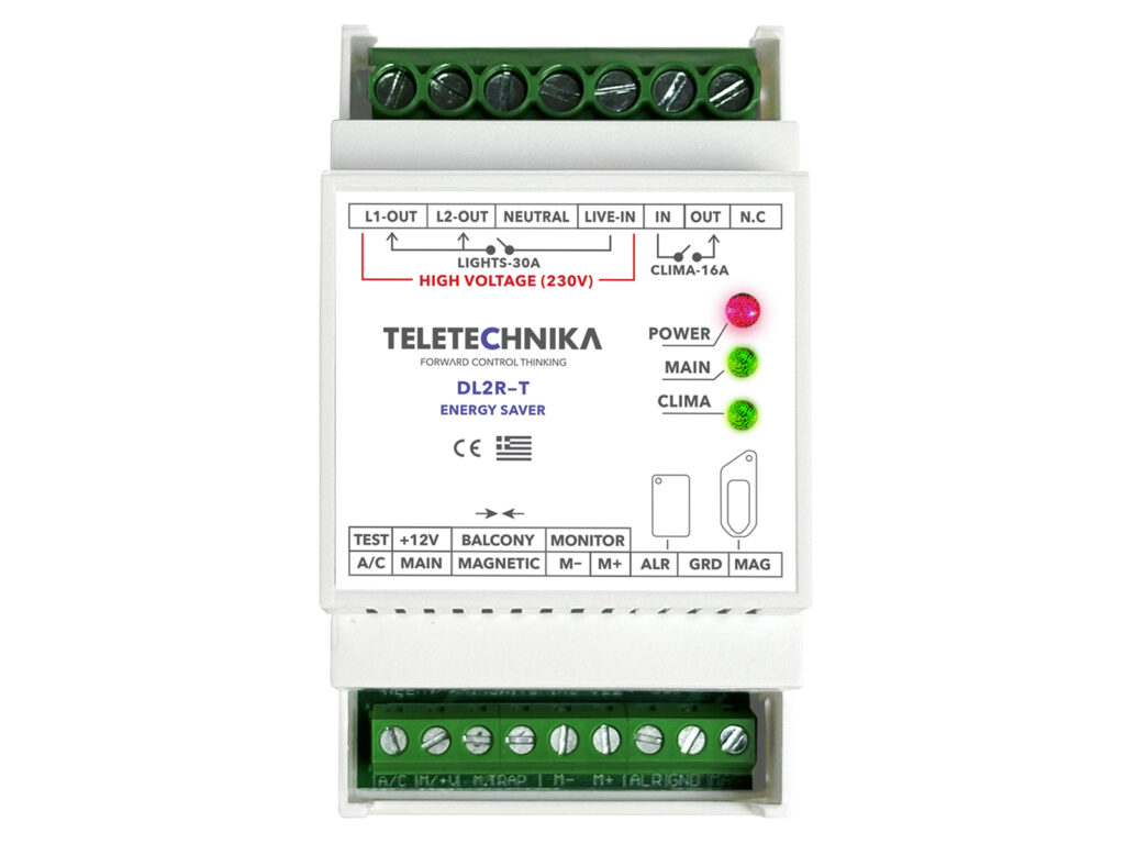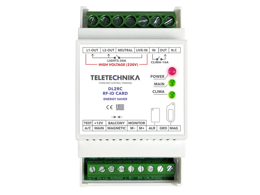 - Έλεγχος φορτίων: Relay επαφής 30Α (resistive load), με 1 ή 3 λεπτά (κατ’ επιλογή) καθυστέρηση στο σβήσιμο, μετά την απομάκρυνση του μπρελόκ.