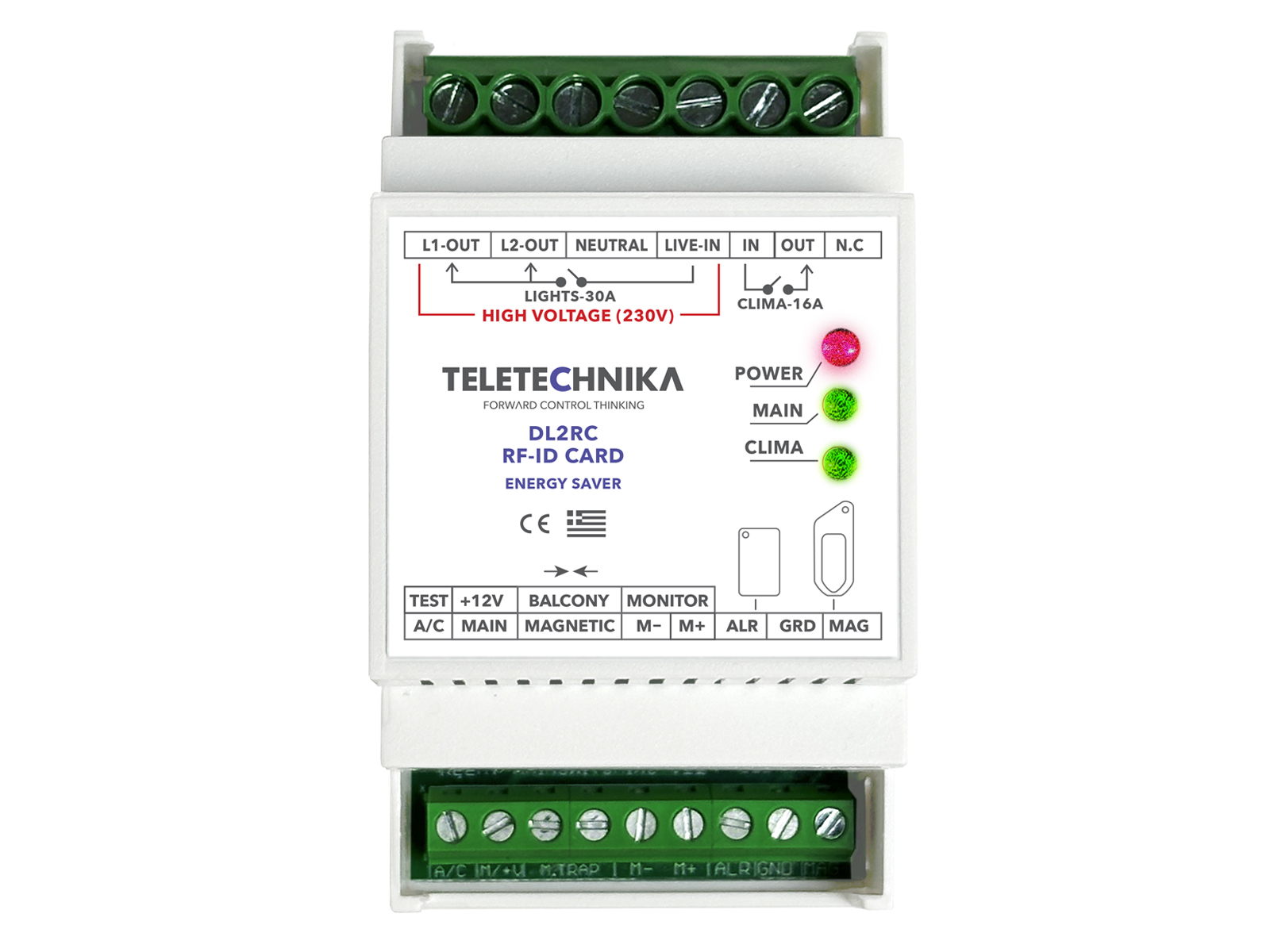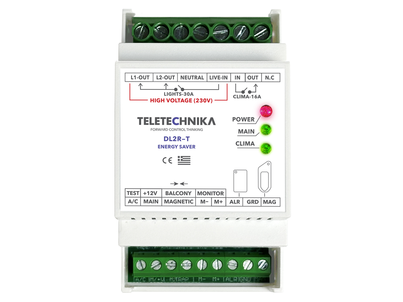 - Οπτικές ενδείξεις λειτουργιών: Τροφοδοσίας (Power), Relay φώτων 30A (MAIN) και Relay κλιματισμού16A (CLIMA), με LED.