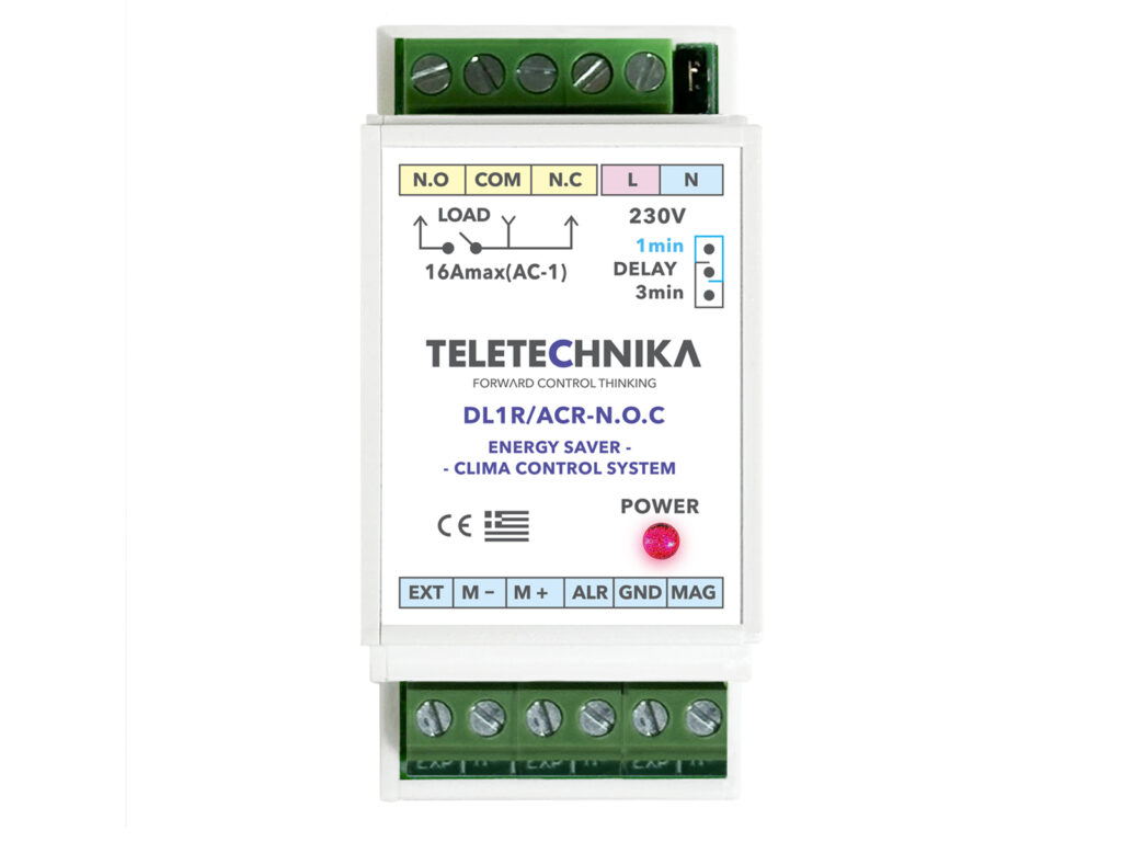 - Έλεγχος κλιματισμού: Relay επαφής 16Α (resistive load-ac1), με τρία (3) λεπτά καθυστέρηση στο σβήσιμο, μετά το άνοιγμα μπαλκονόπορτας με παρουσία μπρελόκ, ή ένα (1) λεπτό μετά την απομάκρυνση του μπρελόκ.